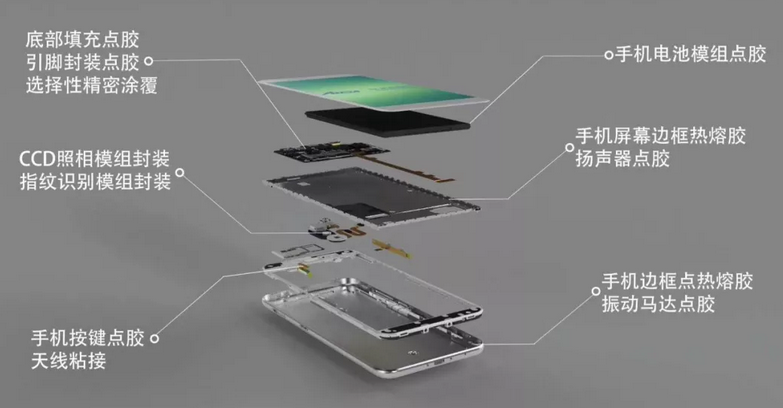 事實上,電子膠粘劑一直以來都在電子電器、汽車、軌道交通、航天航空、軍工等工業制造領域發揮意想不到的驚人作用和舉足輕重的價值。就智能手機而言,其主要膠水應用主要要以下幾種: